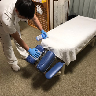 ①消毒 施術後はアルコール消毒液を用いてベッドはもちろんのこと、椅子・小物置き・扉の取手やハンガー等の消毒を行なっております。 ※消毒液は「イソプロピルアルコール 濃度50%」を使用し、吹きかけ後に拭き取りを行なっております。